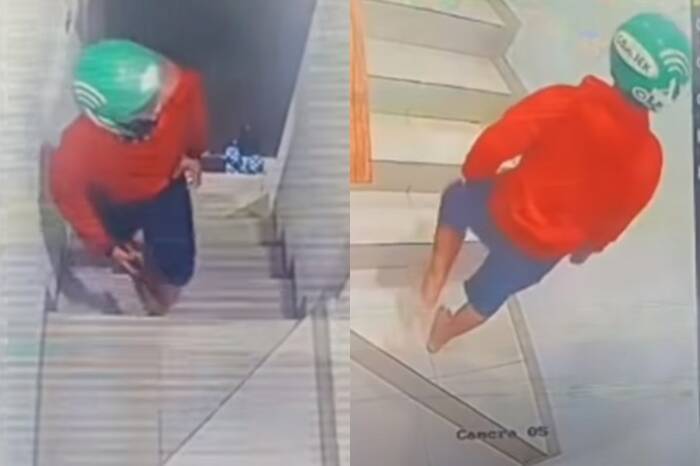 Dari rekaman CCTV di lokasi kejadian, terlihat seorang pria mengenakan helm ojek online sedang berjalan naik ke lantai 2 penginapan tersebut.