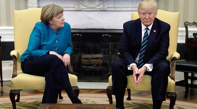 Keakraban yang diwakili jabat tangan kedua pemimpin tak ditunjukkan Trump saat menerima Kanselir Jerman Angela Merkel. Kala itu keduanya duduk di sofa kuning yang sama.