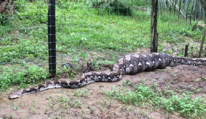 Hewan itu berada di dekat pagar kawat besi tak mampu melata lagi karena kekenyangan. Dikabarkan python itu baru menelan dua ekor kambing.