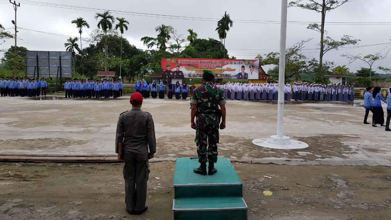 HARIANRIAU.CO - Disela sela kesibukan melaksanakan Program Tentara Manunggal Membangun Desa (TMMD) Komandan Komando Rayon Militer (Danramil) 07/Reteh Kapten Arm Syahrul Effendi.P, menyempatkan diri untuk menjadi inspektur upacara (Irup) pada upacara Bendera Hari Kesadaran Nasional 17 Hari bulan yang dilaksanakan di lapangan kantor camat keritang, Selasa (17/04/18).