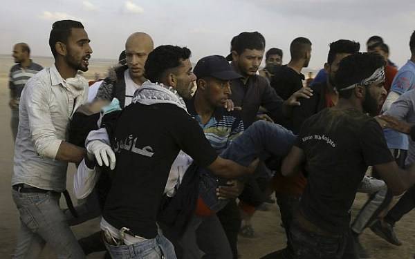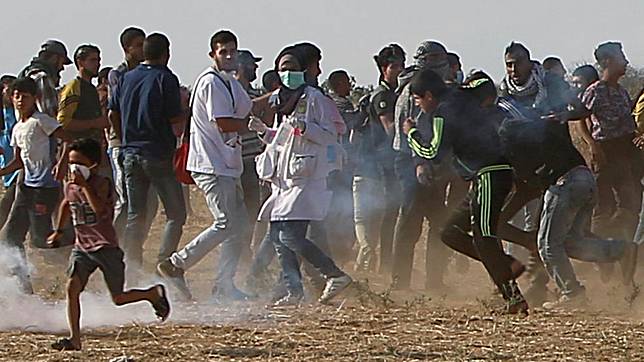 9. Para pengunjuk rasa Palestina mengevakuasi Razan setelah ditembak