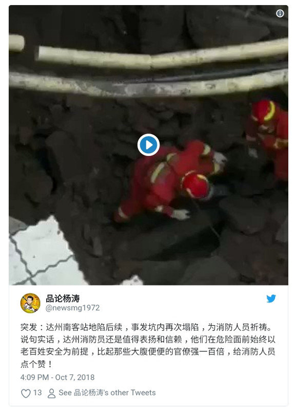Sebuah video menunjukkan saat bekas lubang trotoar runtuh lebih jauh ketika dua petugas pemadam kebakaran bekerja di dalam untuk mencari korban.