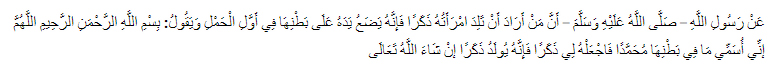 Allahumma inni usammii maa fii bathni zaujatii muhammadan, faj’alhu lii dzakaran, bihaqqi shohibi hadzal ismisy syariif sayyidina muhammadan shallallahu ‘alaihi wasallam
