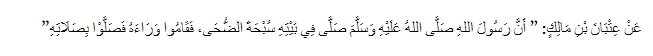 Sementara itu, shalat Dhuha merupakan ibadah yang tidak disyariatkan untuk dilaksanakan secara berjamaah. Namun, sesekali melakukan shalat Dhuha berjamaah itu tetap sah. Hal ini pernah dilakukan Nabi saw. bersama sahabat di rumah Itban bin Malik berikut ini: