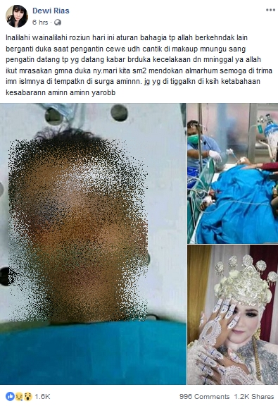 "Inalilahi wainalilahi roziun hari ini aturan bahagia tapi allah berkehendak lain berganti duka saat pengantin cewe udah cantik dimakaup menungu sang pengatin datang tapi yang datang kabar berduka kecelakaan dan mninggal ya Allah ikut mrasakan gimana dukanya. Mari kita sama-sama mendokan almarhum semoga ditrima iman Islamnya ditempatkn di surga aminnn. Juga yang ditiggalkan dikasih ketabahaan kesabarann aminn aminn yarobb," tulis Dewi seperti brilio.net kutip pada Kamis (21/2).