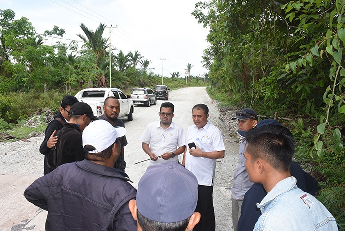 Tim Pendamping dan Audit Teknis dari UIR, Mukhfid, ketika melakukan peninjuaan dan pengejekan pengerjaan proyek jalan Kelemantan-Sekodi, didampingi Kabid Pembangunan Jalan dan Jembatan, Diongi serta pegawai PUPR, Rabu, 24 April 2019.