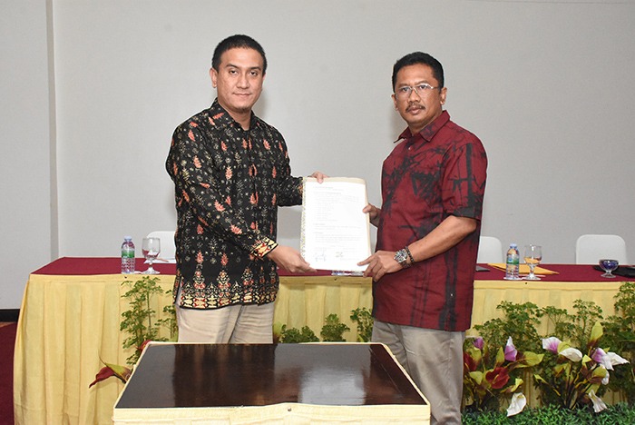Kadis PUPR, Hadi Prasetyo dan Ketua Tim Pendamping dan Audit dari UIR usai menandatangani MoA dan NKPT, Kamis 11 April 2019.
