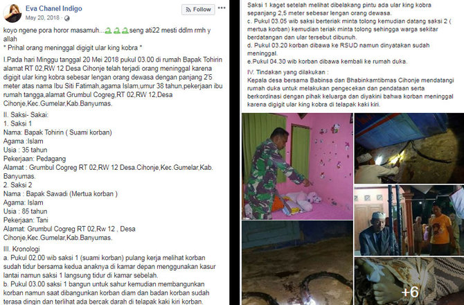 “Tohirin akhirnya sadar istrinya telah dipatuk setelah melihat ada seekor ular king kobra sebesar lengan orang dewasa dan panjang sekitar 2,5 meter bersembunyi di belakang pintu kamar,” jelas Kusworo, Koordinator Tim Reaksi Cepat (TRC) Badan Penanggulangan Bencana Daerah (BPBD) Banyumas.