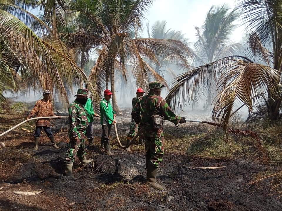 HARIANRIAU.CO - Dengan seragam lengkap, anggota polisi yang bertugas sebagai Bhabinkamtibmas di Kecamatan Gaung, Kabupaten Indragiri Hilir, Riau, Brigadir Ilfa Ratno berjibaku memadamkan api yang merambat ke kebun kelapa masyarakat Desa Lahang Hulu, Sabtu (3/8).