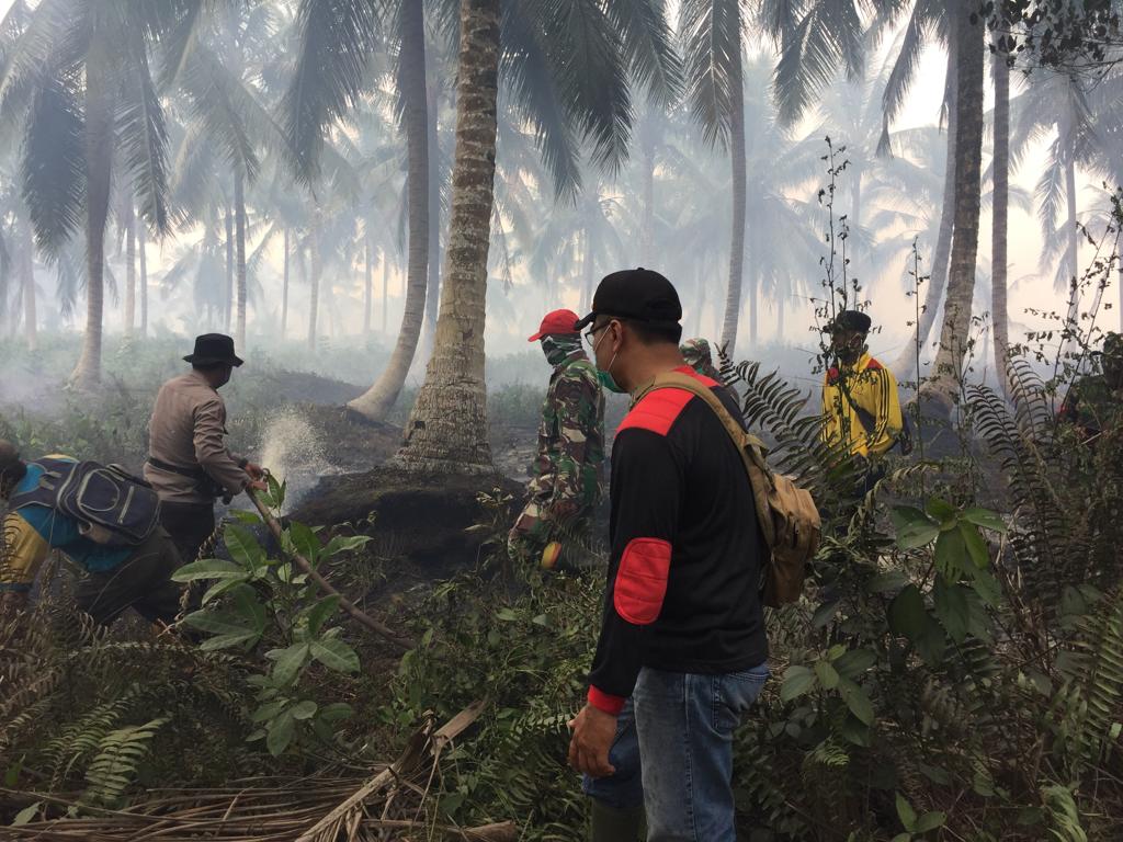 "Tanah gambut tebal kedalaman 3 meter dan tanah dalam keadaan kering disertai angin akibat musim kemarau bulan ini. Angin kencang dan panas dengan suhu 34° sehingga api dengan cepat menjalar ke areal perkebunan kelapa milik warga namun saat ini belum dapat dipadamkan secara keseluruhan," ungkapnya.