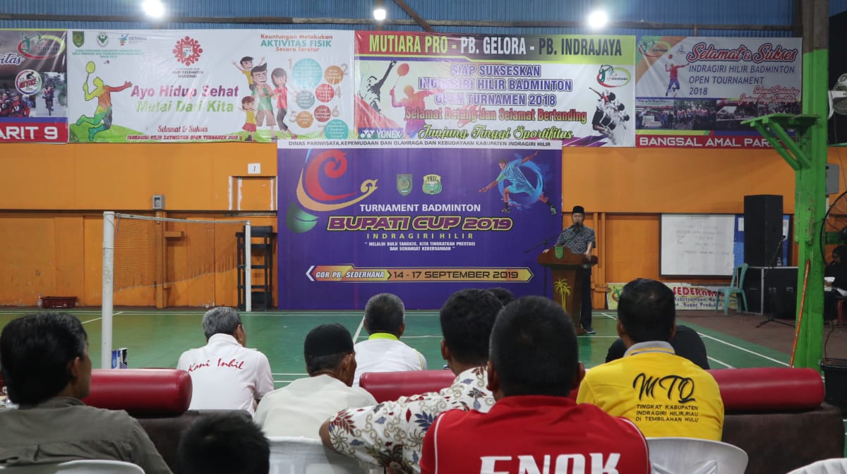 HARIANRIAU.CO -  Wakil Bupati Inhil Syamsuddin Uti menghadiri acara penutupan Turnamen Badminton Bupati cup 2019 Indragiri Hilir dengan tema 'Melalui bulu tangkis, kita tingkatkan prestasi dan semangat kebersamaan'  yang di laksanakan di  Gor PB. Sederhana dari tangga 14-17 September 2019. Senin (16/09/2019) malam.