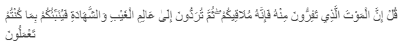 Artinya: Katakanlah: "Sesungguhnya kematian yang kamu lari daripadanya, maka sesungguhnya kematian itu akan menemui kamu, kemudian kamu akan dikembalikan kepada (Allah), yang mengetahui yang ghaib dan yang nyata, lalu Dia beritakan kepadamu apa yang telah kamu kerjakan".