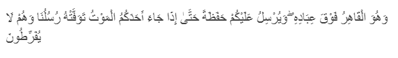 Wa huwal-q?hiru fauqa 'ib?dih? wa yursilu 'alaikum ?afa?ah, ?att? i?? j?`a a?adakumul-mautu tawaffat-hu rusulun? wa hum l? yufarri??n