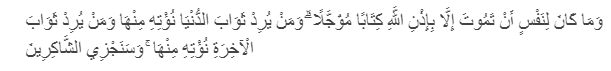 Wa m? k?na linafsin an tam?ta ill? bi`i?nill?hi kit?bam mu`ajjal?, wa may yurid ?aw?bad-dun-y? nu`tih? min-h?, wa may yurid ?aw?bal-?khirati nu`tih? min-h?, wa sanajzisy-sy?kir?n