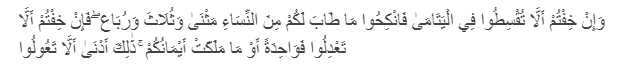 Wa in khiftum all? tuqsi?? fil-yat?m? fangki?? m? ??ba lakum minan-nis?`i ma?n? wa ?ul??a wa rub?', fa in khiftum all? ta'dil? fa w??idatan au m? malakat aim?nukum, ??lika adn? all? ta'?l?