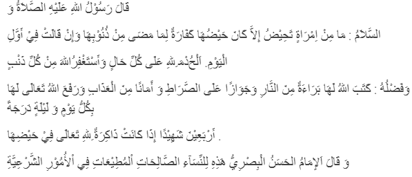 Contohnya dalam Kitab Durratun Nashihin fil Wa’zhi wal Irsyad karya Syaikh Utsman bin Hasan bin Ahmad Syakir al-Khubari, dijelaskan tentang cara perempuan menyikapi rasa perih ketika haid. Yaitu melakukan amalan sunah berupa zikir.