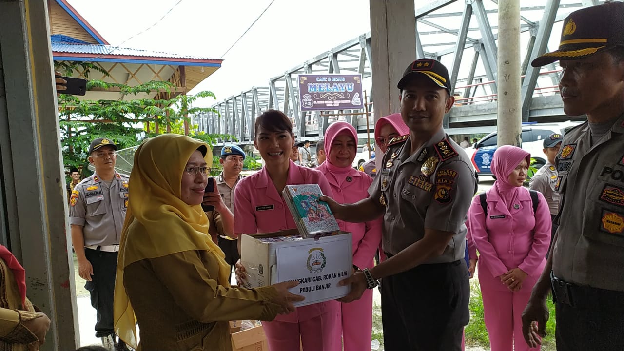 Kapolres Rokan Hilir AKBP M.Mustofa, melalui Kasubbag Humas Polres Rohil AKP Juliandi menjelaskan kunjungan jajaran polres Rohil dan Bhayangkari kelokasi banjir memberikan bantuan kemanusian dan pelayanan kesehatan gratis.