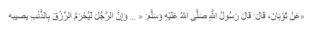 Dari Tsauban bahwa Rasulullah shalallahu alaihi wasallam bersabda: (Sesungguhnya seseorang akan terhalang dari rezekinya karena dosa yang ia lakukan” (HR Ibnu Majah)