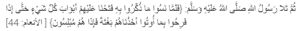 Kemudian Rasulullah shalallahu alaihi wasallam membaca ayat: “Maka tatkala mereka melupakan peringatan yang telah diberikan kepada mereka, Kamipun membukakan semua pintu-pintu kesenangan untuk mereka; sehingga apabila mereka bergembira dengan apa yang telah diberikan kepada mereka, Kami siksa mereka dengan sekonyong-konyong, maka ketika itu mereka terdiam berputus asa.” (Al-‘An`?m: 44)