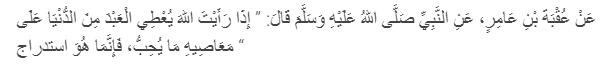 Dari Uqbah bin Amir bahwa Nabi shalallahu alaihi wasallam bersabda: “Jika kau melihat Allah memberi nikmat dunia -sesuai keinginannya- kepada seseorang atas perbuatan dosanya, maka hal itu adalah istidraj (kenikmatan semu yang berakhir musibah).