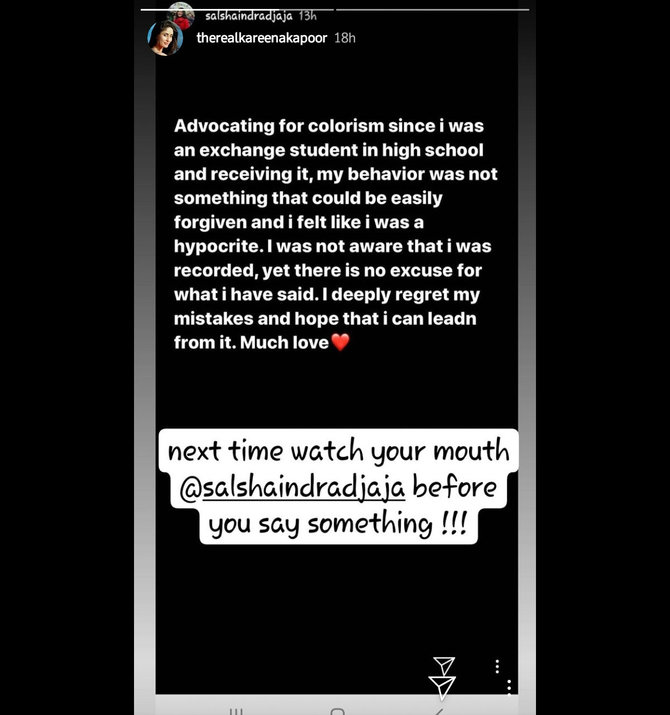 Gara-gara video tersebut, Salsha pun lantas dianggap rasis. Sampai-sampai akun @therealkareenakapoor ikut berkomentar dan meminta Salsa agar hati-hati sebelum berbicara apapun. Komentar dari @therealkareenakapoor kemudian menjadi bahan pemberitaan sejumlah media dan menyebut akun tersebut akun resmi milik Kareena.