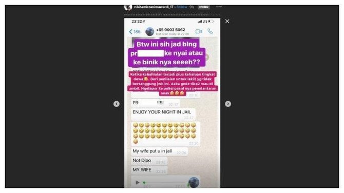Sementara itu, Niki sempat mengungkapkan pesan yang dikirim oleh Sajad. Kali ini, Sajad mengirim pesan melalui WhatsApp pada ibu dari anaknya itu. Unggahan tersebut memperlihatkan pesan Sajad sejak 26 Oktober 2019 lalu.