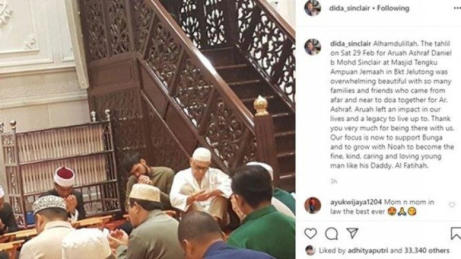 "Alhamdulillah. The tahlil on Sat 29 Feb for Aruah Ashraf Daniel b Mohd Sinclair at Masjid Tengku Ampuan Jemaah in Bkt Jelutong was overwhelming beautiful with so many families and friends who came from afar and near to doa together for Ar. Ashraf," tulis Khadijah Sinclair.
