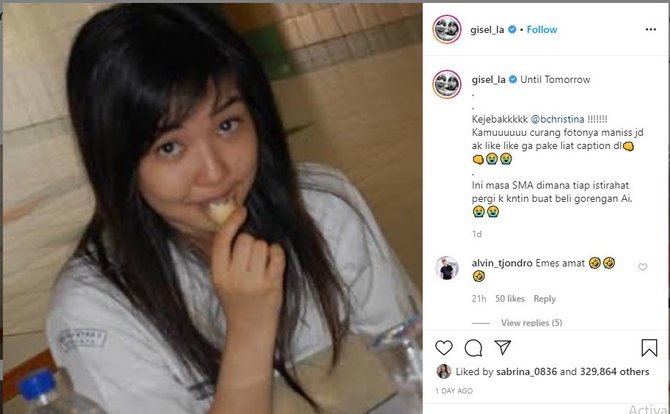 Salah satu artis yang juga terkena tantangan ini, adalah Gisella Anastasia atau kerap dipanggil Gisel. Pada instagamnya, ia memilih untuk mengunggah sebuah foto zaman SMA lengkap dengan mengenakan seragam putih abu abu.