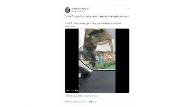 "Drive Thru jadi solusi adakan resepsi di tengah pandemi. Jomblo bisa sewa Grab biar nggak keliatan sendirian. Untuk yang bertanya, amplop itu dikasih di awal. Ada kotak khusus yang disediakan. Selanjutnya, para tamu diberikan catering berupa besek yang bisa dibawa pulang. Yang naik motor juga ada, tapi belum lihat yang bawa beat," tulis Tri Adhianto Tjahyono melalui akun Twitter @mas_triadhianto.