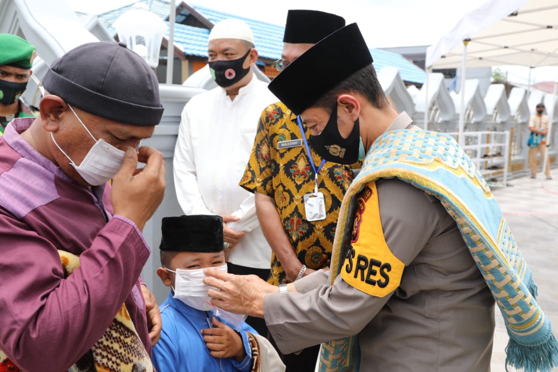 HARIANRIAU.CO - Dalam Kegiatan Jum'at Berkah, Dandim 0314/Inhil dan Kapolres Inhil melaksanakan pembagian masker kepada jamaah Masjid Jam'i Raudhatul Muslimin Tembilahan kurang lebih 200 masker, Jumat (2/10/2020)