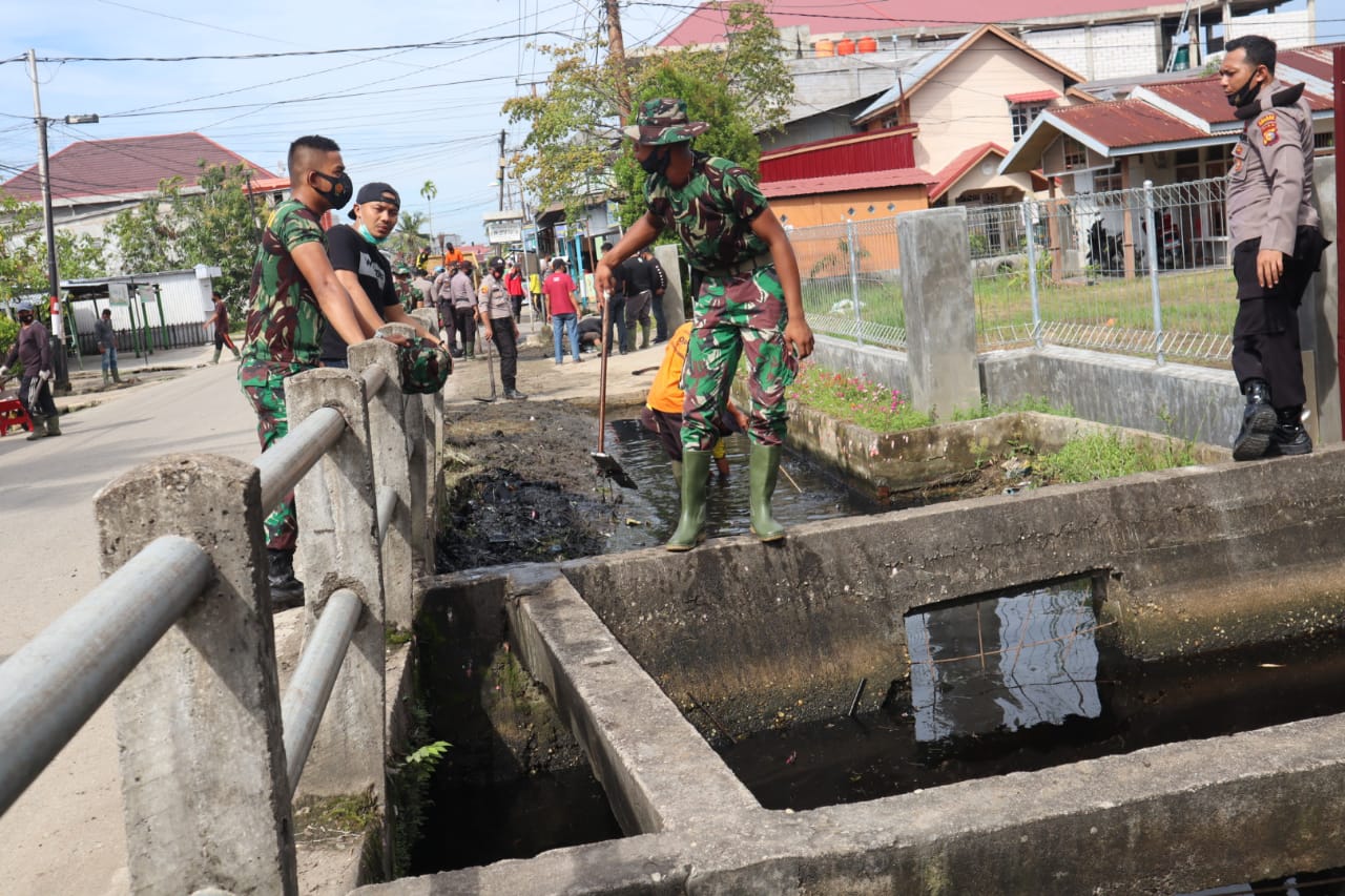 HARIANRIAU.CO - Personil Kodim 0314/Inhil bersama Polres Inhil dan masyarakat kembali melaksanakan karya bhakti gotong royong di ruas Jalan Lingkar I Parit 12 dan Parit 13 membersihkan got-got yang banyak tergenang air, Sabtu (10/10/2020).
