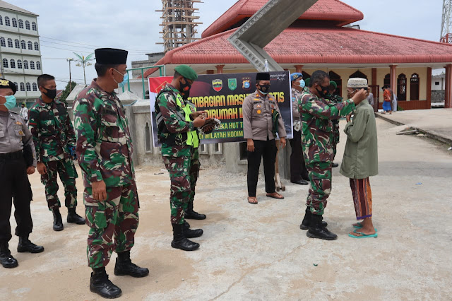 HARIANRIAU.CO - Masih dalam suasana HUT TNI ke 75 dan menggencarkan penegakkan disiplin protokol kesehatan, Kodim 0314/Inhil bersama Polsek Tembilahan Hulu melakukan pembagian masker di tempat Ibadah, Jumat (23/10/2020).