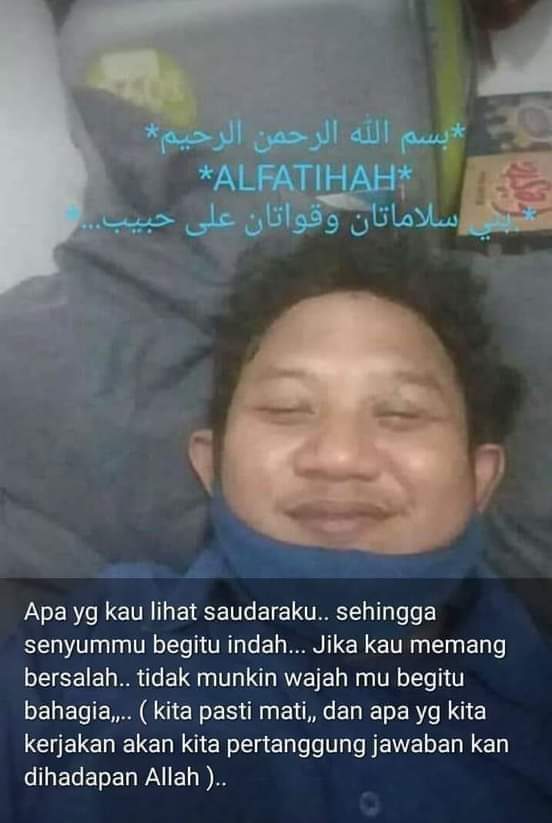 Dalam foto yang diposting oleh akun Twitter @kopipahitgitulo, wajah jenazah Muhammad Suci terlihat tersenyum dengan mata tertutup.