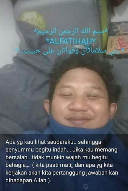 HARIANRIAU.CO - Beredar di media sosial, foto jenazah salah satu anggota FPI tersenyum saat meninggal ketika tewas ditembak polisi. Jenazah ini disebut Muhammad Suci Khadafi Poetra.