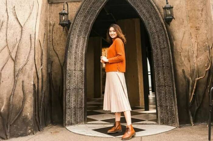 Dalam foto tersebut, ia nampak cantik menggunakan sweater berwarna oranye yang dipadukan dengan rok krem dan sepatu boots.