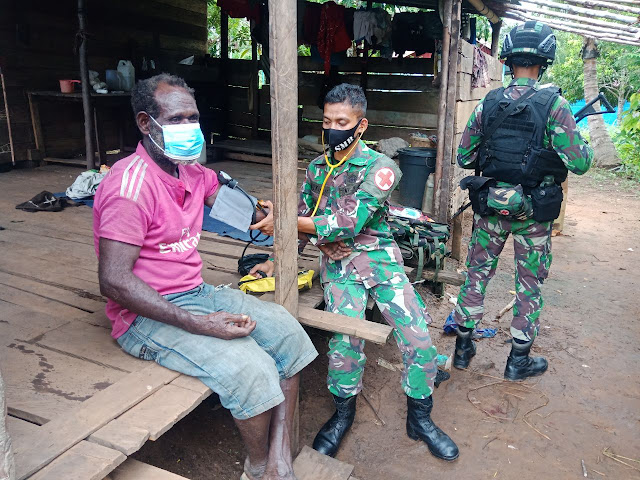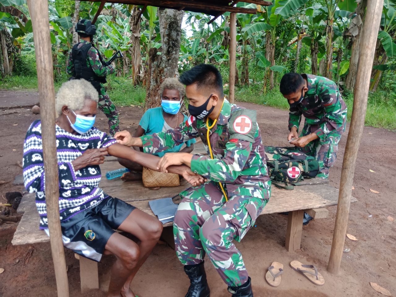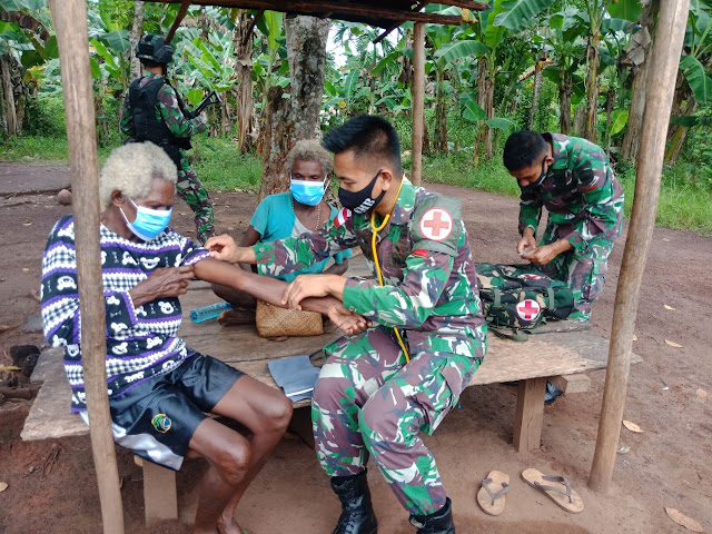 HARIANRIAU.CO - Menjaga dan memelihara kondisi kesehatan masyarakat perbatasan, Satgas Pamtas RI-PNG Yonif 125/SMB di bawah Komando Pelaksana Operasi (Kolakops) Korem 174/ATW memberikan pelayanan kesehatan kepada warga Kampung Toray, Distrik Sota, Kabupaten Merauke, Rabu (13/1/2021).