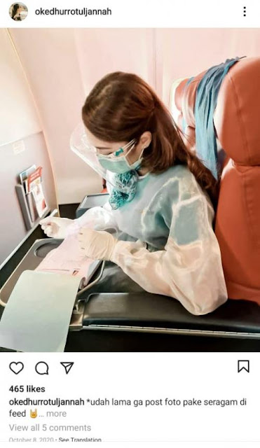 Di foto terlihat potret Oke sedang duduk di kursi penumpang pesawat sembari menulis di atas kertas. Demi mencegah penyebaran virus corona, Oke mematuhi protokol kesehatan dengan memakai masker serta face shield yang menutupi wajahnya.