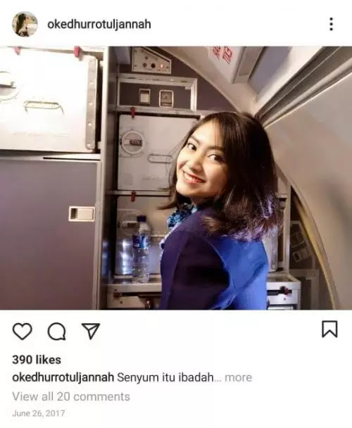 Foto ini memperlihatkan Oke sedang berada di kabin pesawat. Masih tetap mengenakan seragam biru khas NAM Air. Oke tersenyum manis ketika di foto dengan kepala menghadap ke arah belakang. Foto di akun Instagram pribadi Oke tersebut telah disukai lebih dari 300 orang.