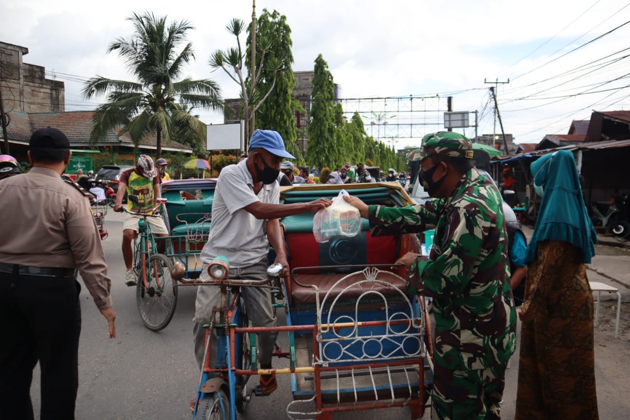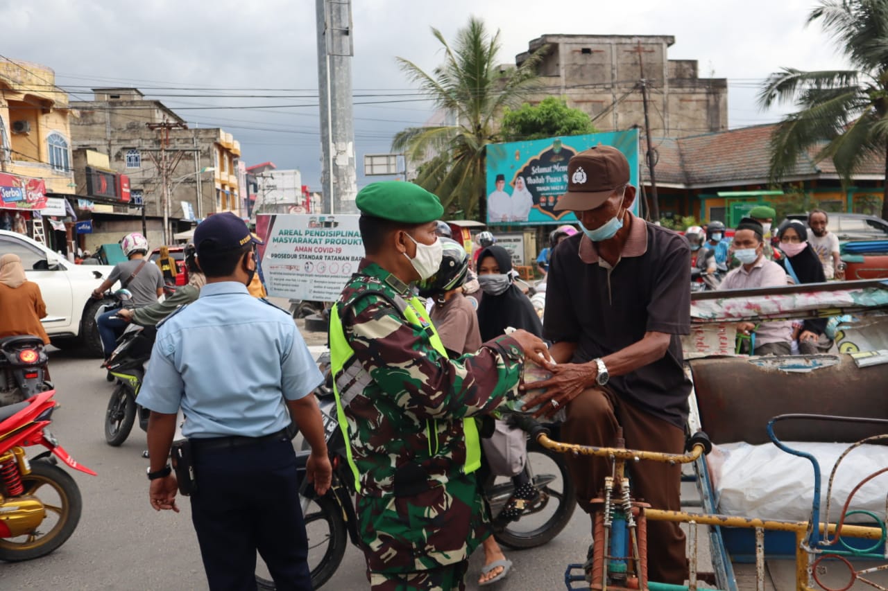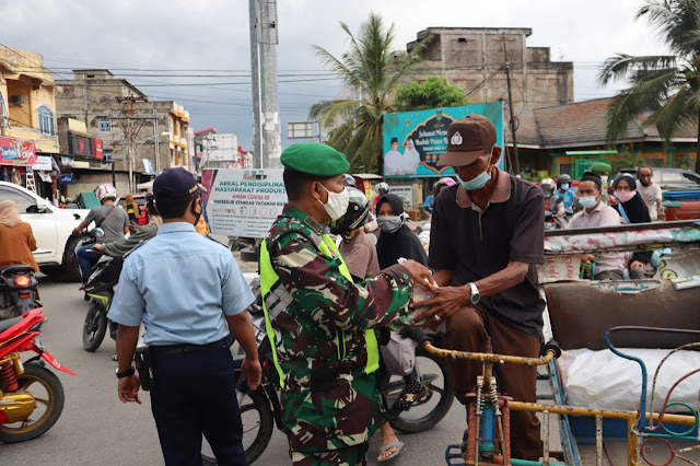 HARIANRIAU.CO - Kodim 0314/Inhil bersama Yayasan Vioni Bersaudara melakukan pembagian masker dan 25 paket Ramadhan kepada masyarakat yang lewat di Bundaran Pasar Pagi, Jalan M Boya Tembilahan, Sabtu 1 Mei 2021.