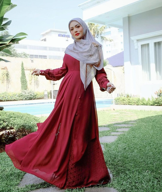 Terlihat perempuan berusia 46 tahun itu mengenakan gamis panjang berwarna merah tua. Dilengkapi dengan hijab motif berwarna lembut yang menutupi dadanya.