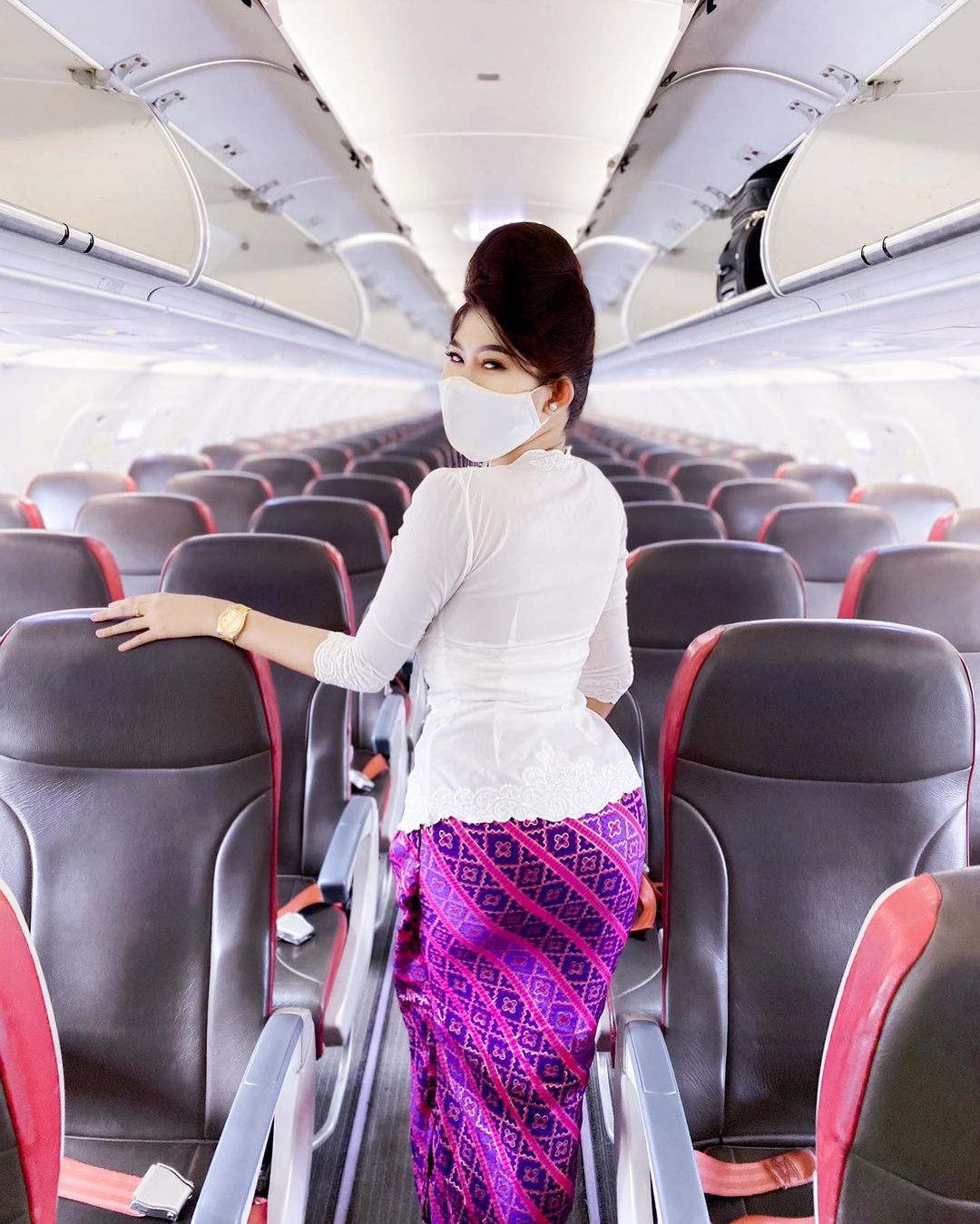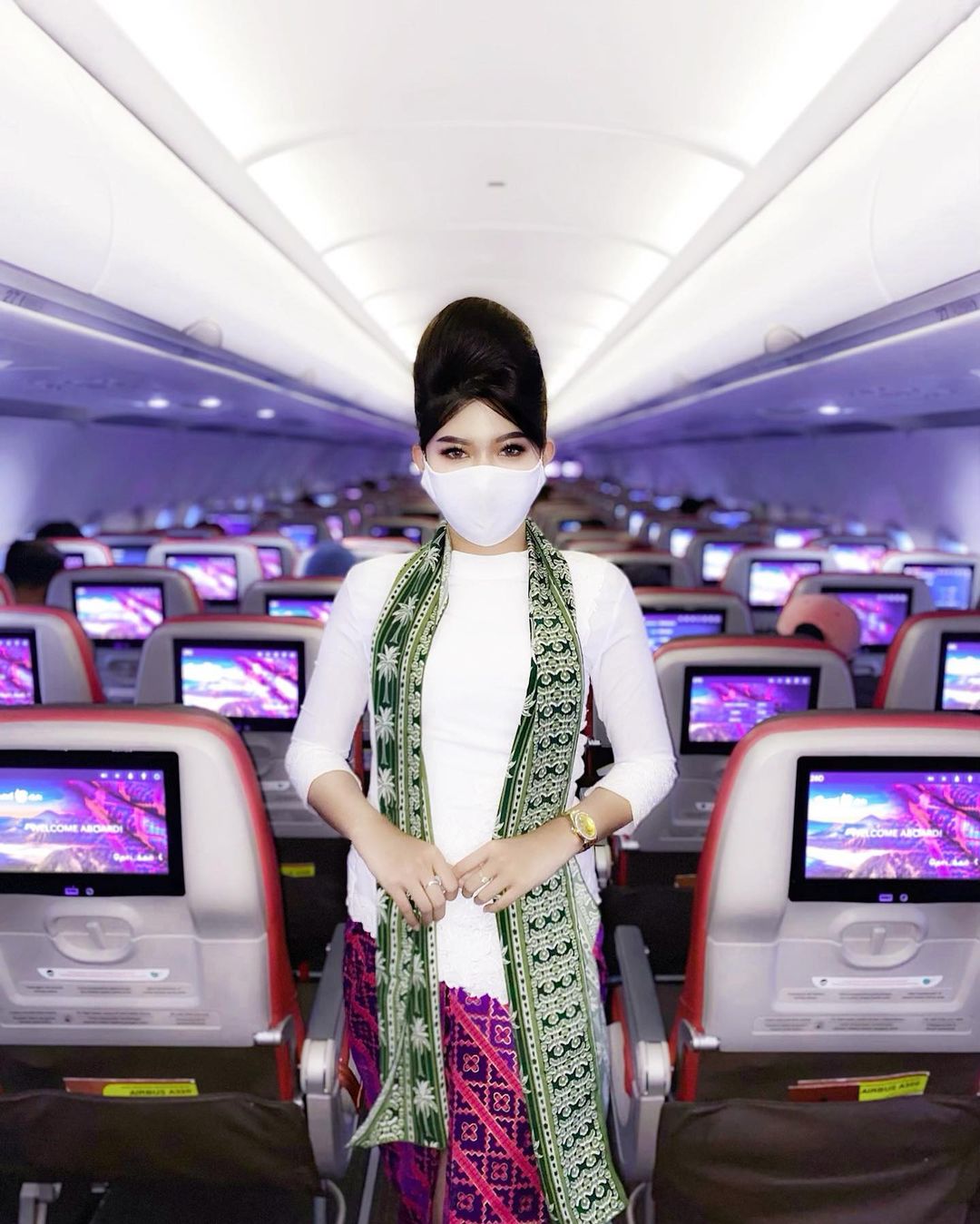 Begitu pula yang dilakukan Dara Agung Ariani. Dengan balutan kebaya putih dan rok batik yang didominasi warna ungu dan merah, ia bergaya di antara kursi-kursi pesawat.