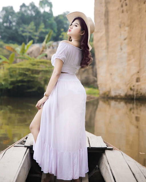 Dalam foto pramugari tersebut tampak tengah berdiri di atas perahu dan memamerkan lekuk tubuhnya yang seksi. Salah satu kakinya mengintip dari balik rok. Alhasil paha mulusnya pun terlihat sedikit.