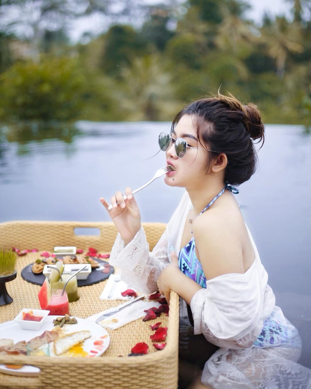 Ia sedang duduk di kolam renang bersama baki berisi makanan di hadapannya. Rambutnya diikat asal, sementara kacamata hitam bertengger di hidungnya. Tak cukup sampai di sana, pramugari cantik ini juga berpose menggigit garpu, membuatnya terlihat amat seksi.