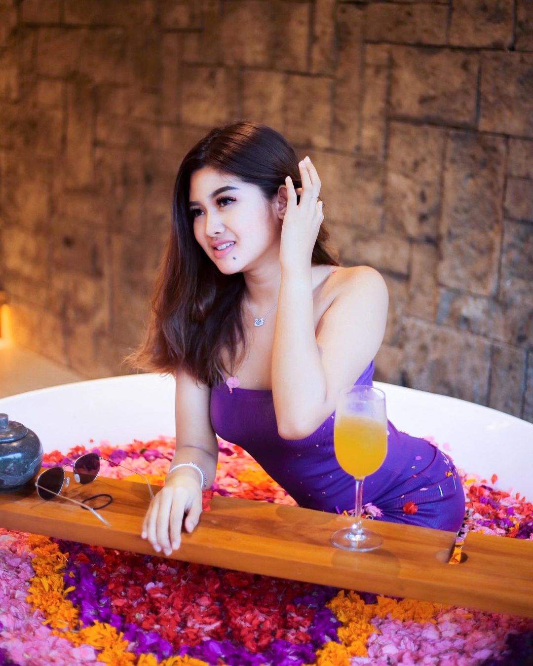 Beberapa waktu lalu Dara Agung Ariani mengunggah fotonya tengah mengenakan dress bermodel kemben. Ia bergaya di sebuah bathtub berisi bunga warna-warni. Warna ungu yang dipilih untuk bajunya berkolaborasi ciamik dengan kulit cerahnya yang sangat mulut.
