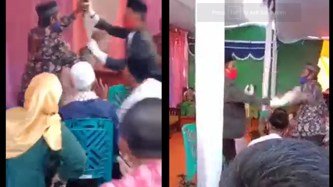 Terjadi keributan dan baku hantam. Mempelai pria yang belum selesai bicara itu pun menjadi sasaran empuk pihak keluarga wanita.