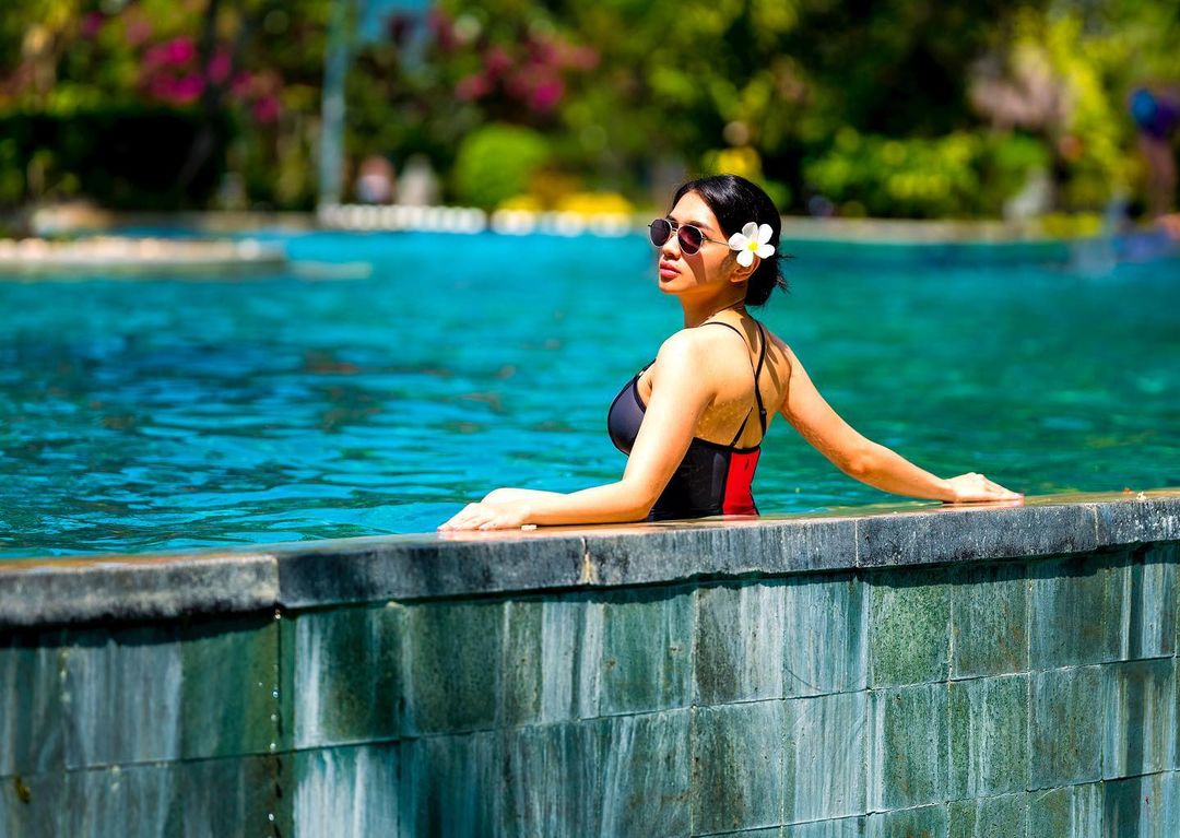 Penampilan Angel Karamoy duduk di tepi kolam renang pun menjadi terlihat seksi.