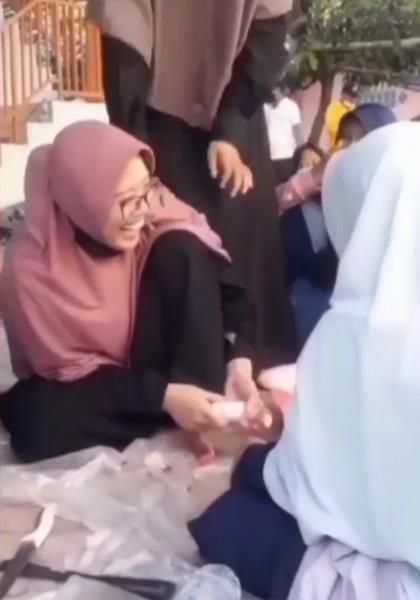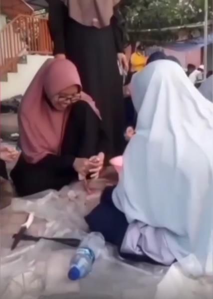 Dalam video itu, tampak sekelompok 'ukhty' sedang sibuk membantu proses pembagian daging hewan kurban.