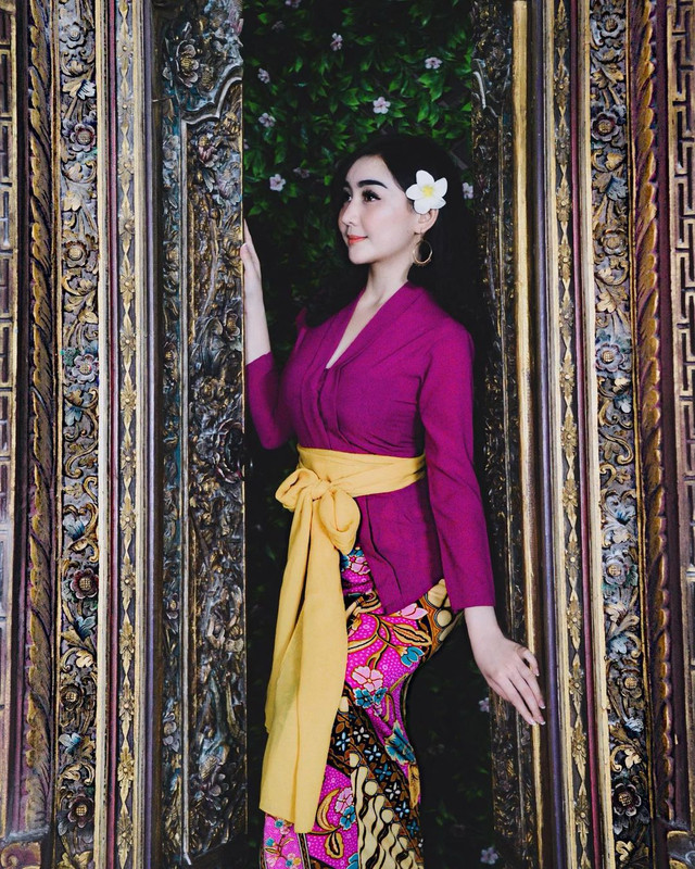 Karina kali ini mengurai rambut panjang indahnya. Ia semakin rupawan saat mengenakan pakaian tradisional khas Bali. Karina juga mengenakan bunga di telinganya yang membuat ia semakin terlihat anggun memesona.