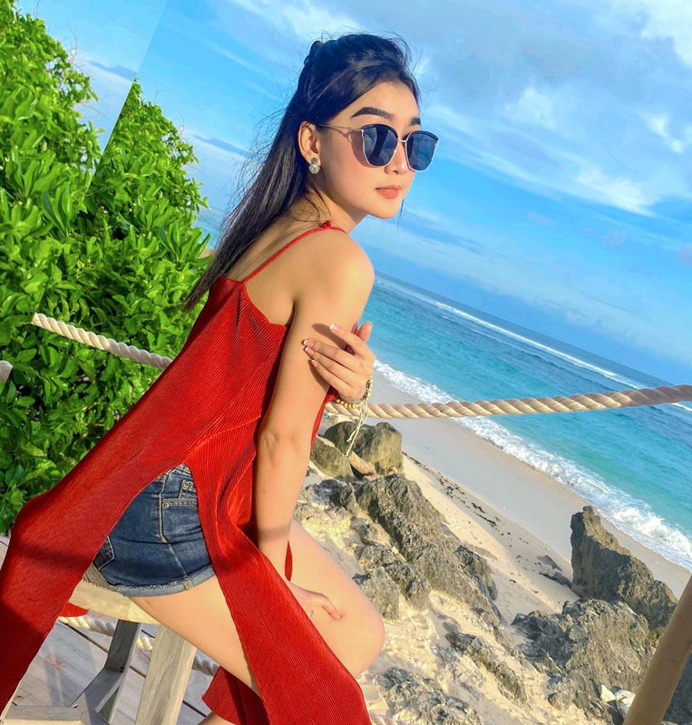 Karina terlihat anggun mengenakan dress merah merona dan celana jins pendek, plus kacamata hitam. Tampilannya kali ini sangat menggoda, netizen pun dibuat jatuh hati dengan penampilannya kali ini.
