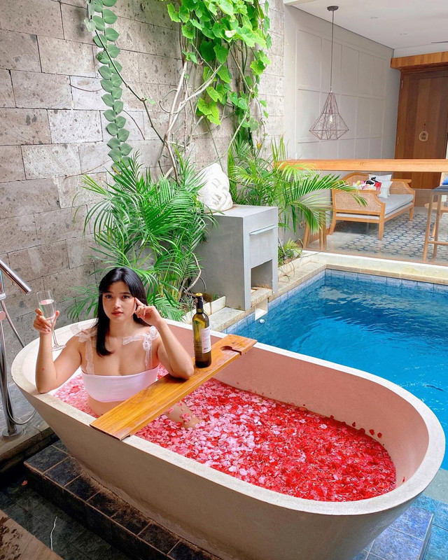 Memiliki kegemaran untuk staycation, pramugari Ananda terlihat berpose manja di bath tub yang dipenuhi dengan kelopak bunga warna-warni.